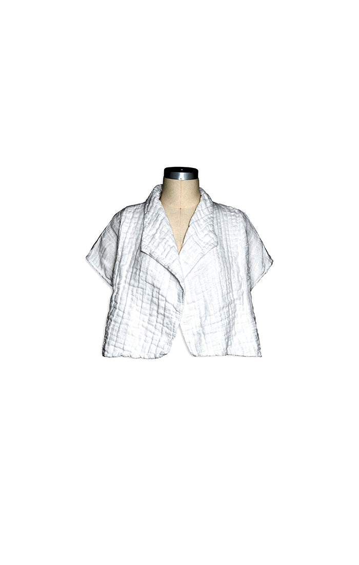 Made in a lightweight, lightly crinkled, cotton gauze, this hip-skimming topper has an open-front construction, with short sleeves and a self lapel, creating a seamless look. We love this over dresses, tanks, and even overalls as a lightweight cover up.