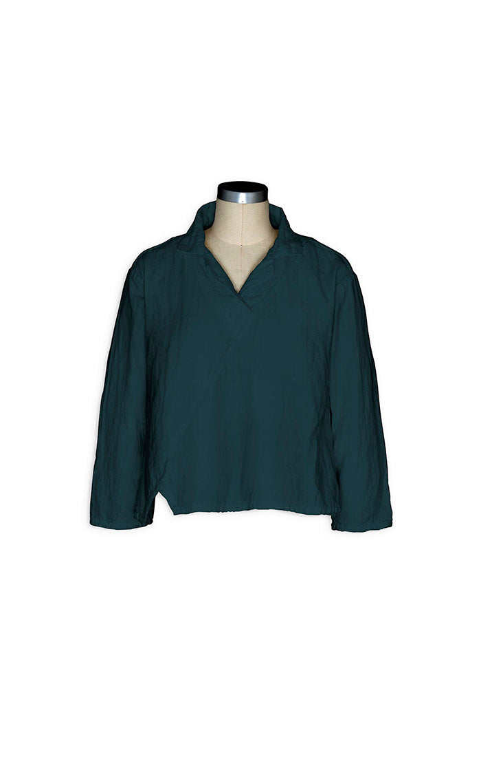 A popover top with a slit open neck with a collar, wrist length sleeves, and boxy body with an angled seam that crosses from shoulder to front right notched hip. Fabric is a heavy cotton gauze.