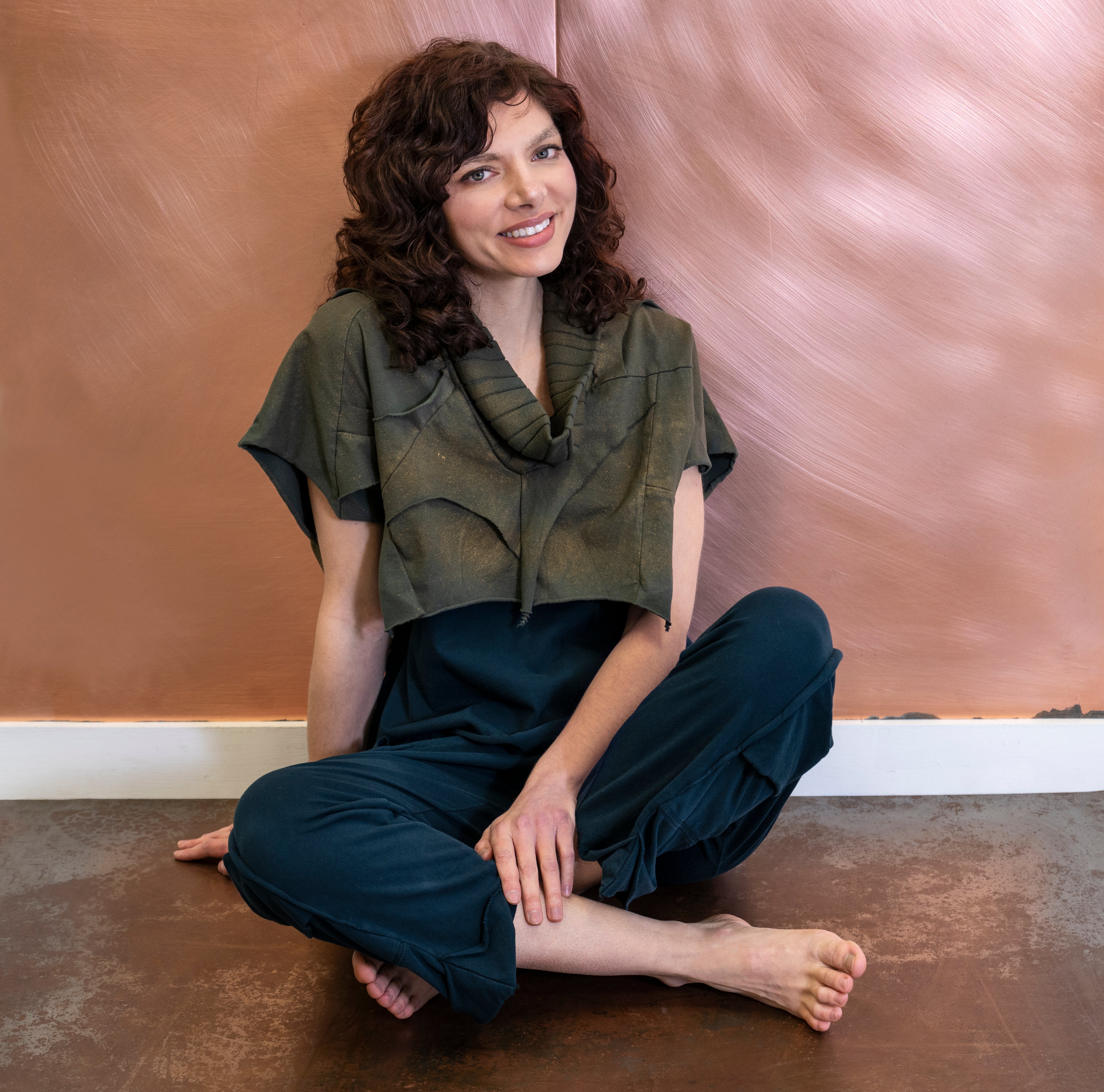 Color: The "Polished" color has an olive background with an airbrushed antique gold finish resulting in a vintage vibe. Each garment is hand dyed in Cynthia's Chicago studio and no two pieces will the same.