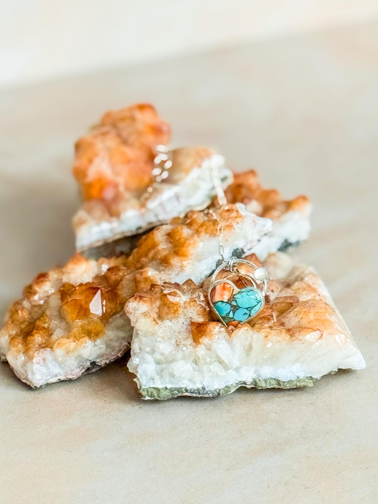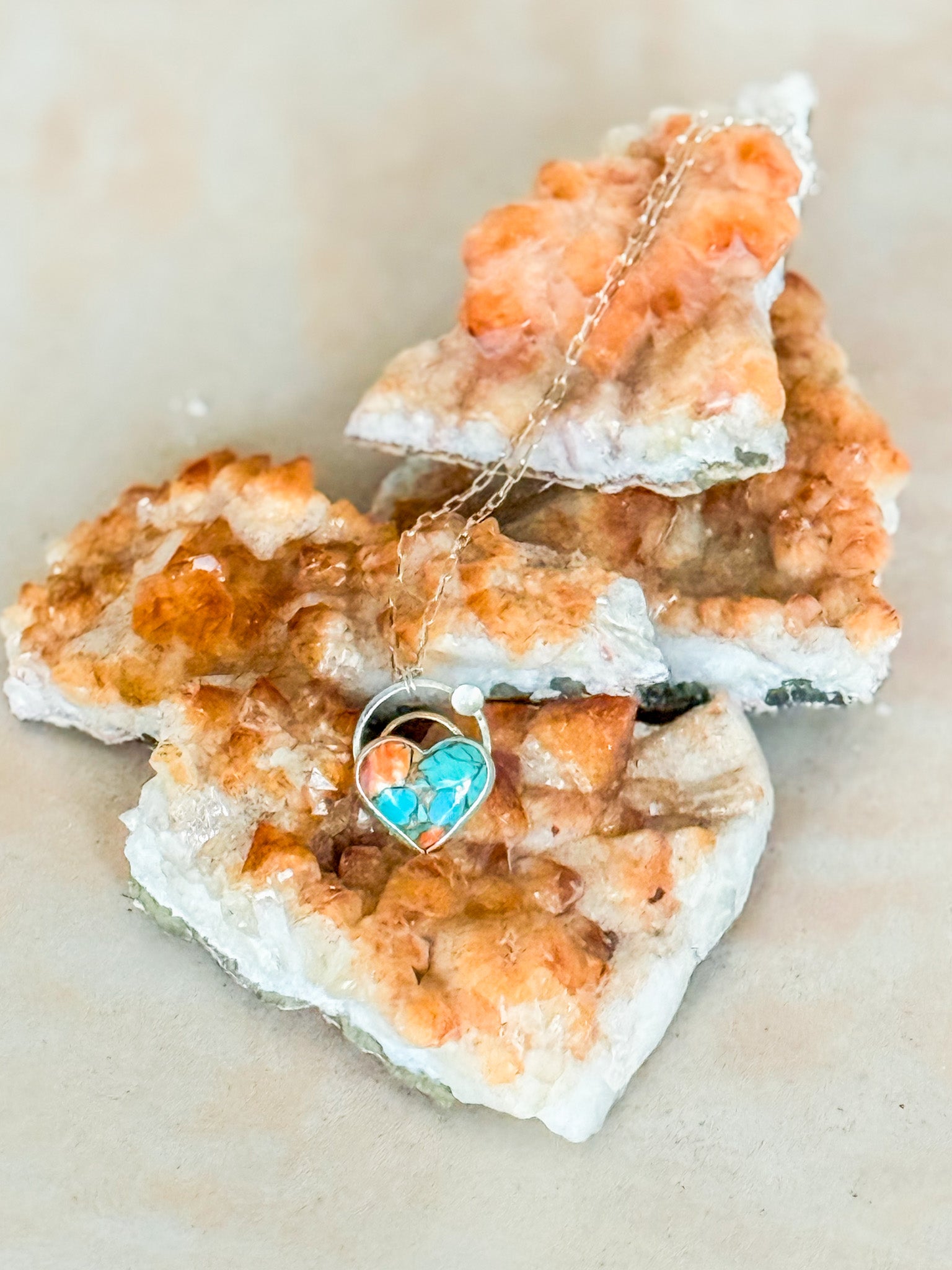 Bold, soulful, and full of heart—this striking necklace is a celebration of color, craftsmanship, and intention. At the center is a luminous heart-shaped composite stone, blending vibrant USA-mined Kingman Turquoise, rich Spiny Oyster Shell, and warm bronze. Each element is carefully fused and bezel-set in sterling silver, creating a one-of-a-kind pendant that radiates strength, beauty, and joy.
